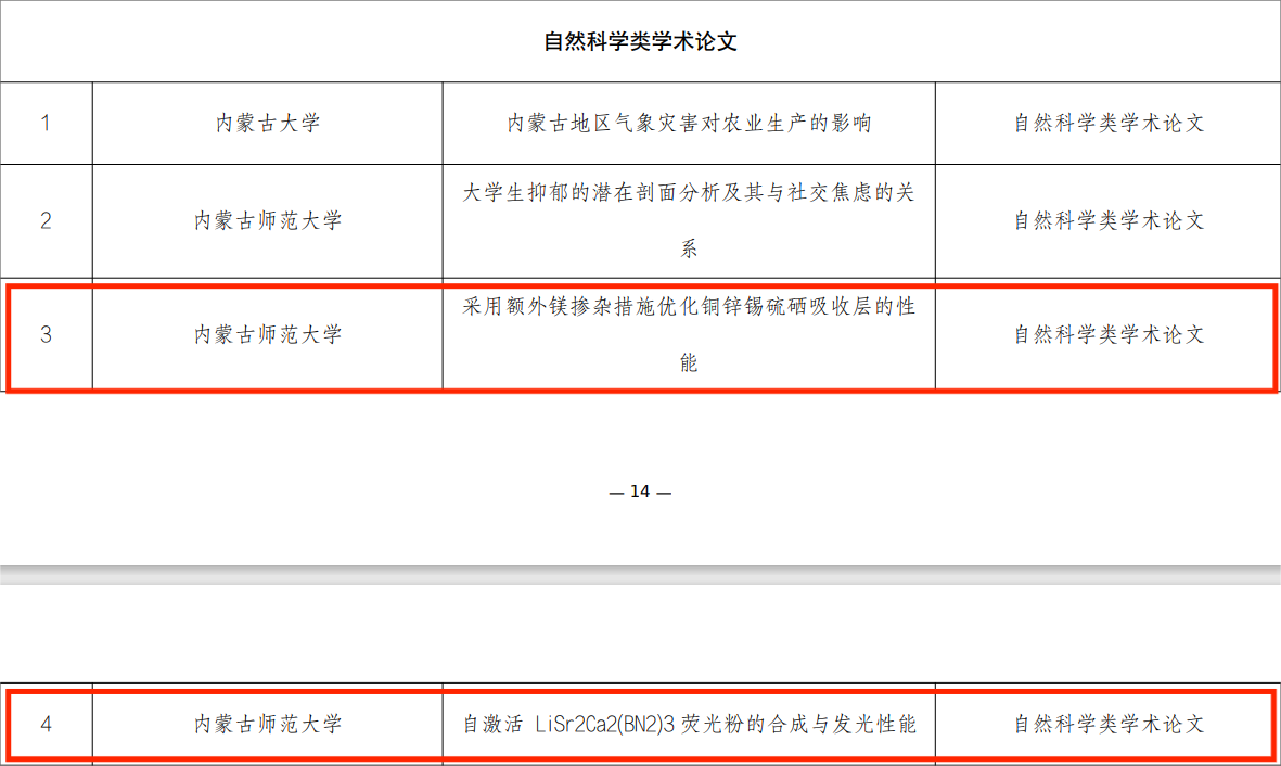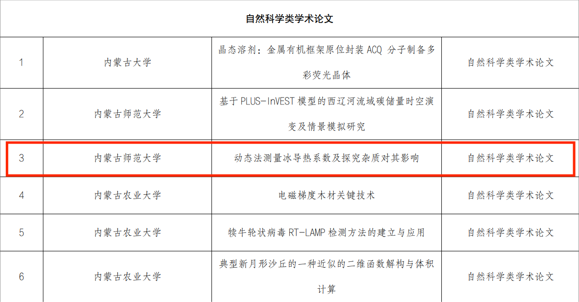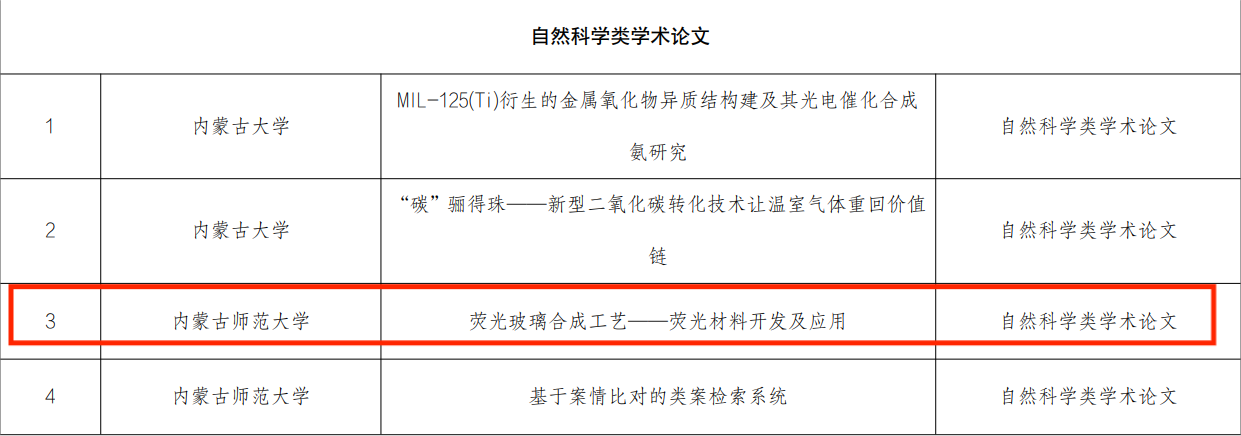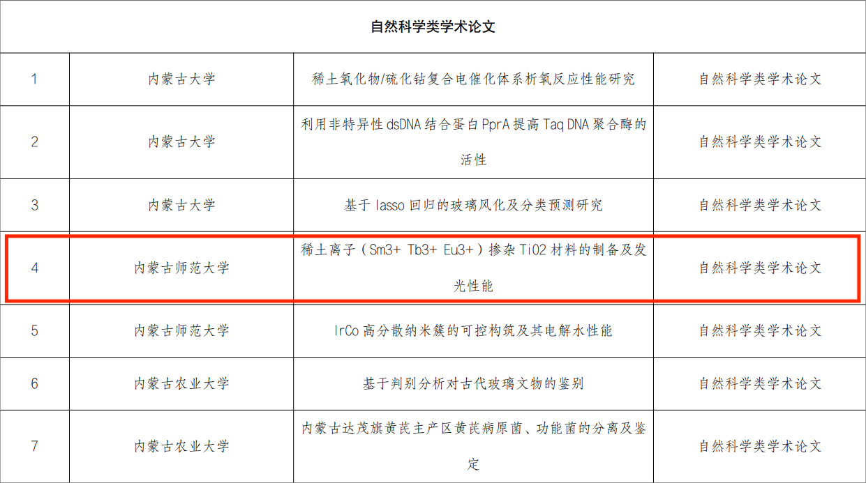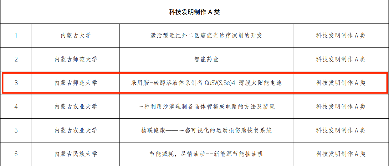 近日,内蒙古自治区第十三届“挑战杯” 全区老员工课外学术科技作品竞赛获奖名单公布,在公司师生的共同努力下,斩获特等奖1项,一等奖3项,二等奖3项,三等奖3项。特等奖是:那仁格日乐老师指导、刘文慧同学负责的自然科学类学术论文:《稀土离子(Sm3+、Tb3+、Eu3+)掺杂TiO2材料的制备及发光性能》;一等奖分别是:张伟老师指导、刘臻奇同学负责的哲学社会科学类调查报告:《内蒙古自治区公费定向师范生学习状况调查研究报告--以williamhill官网为例》;杨帆老师指导、李波兴同学负责的科技发明制作:《基于视觉追踪的非接触呼吸检测雷达》;朝克夫老师指导、李月朋同学负责的自然科学类学术论文:《动态测量冰导热系数》;二等奖:由杨艳春老师指导、曹铭旸同学负责的自然科学类学术论文:《采用额外镁掺杂措施优化铜锌锡硫硒吸收层的性能》;由朝克夫老师指导、廖雨负责的:《自激活 LiSr2Ca2(BN2)3 荧光粉的合成与发光性能》;由杨帆老师指导、吴倩倩负责的:《虚拟仿真助力偏远地区物理实验教学一完全弹性碰撞,相遇追击,天体物理 》;三等奖:由杨艳春老师指导、任俊婷同学负责的科学发明制作:《采用胺-硫醇溶液体系制备Cu3 (S.Se)4薄膜太阳能电池》;由朝克夫老师指导、廖雨同学负责的科学发明制作:《看见声音演示仪》;由朝克夫老师指导、邹子安同学负责的自然科学学术论文:《荧光玻璃合成工艺-荧光材料开发及应用》。