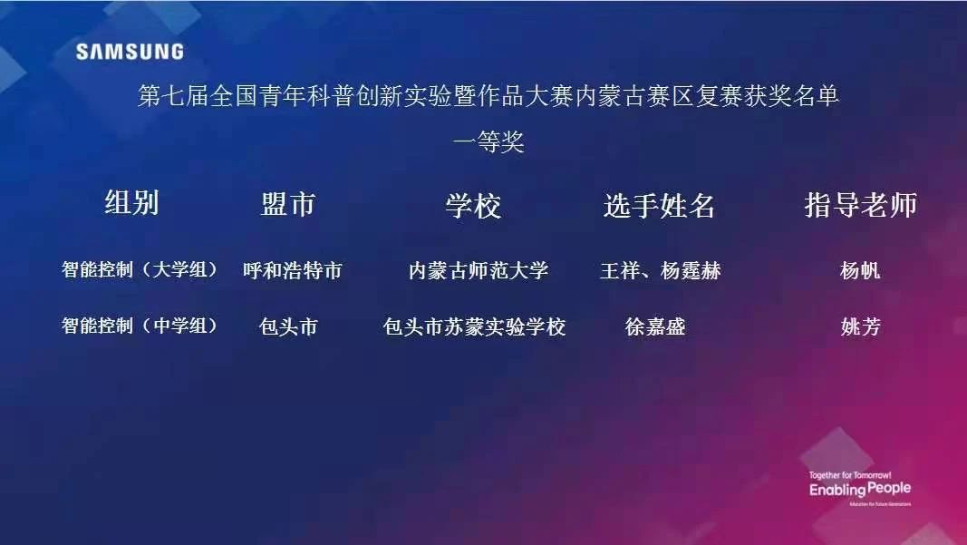 4月25日,由内蒙古科协、内蒙古教育厅主办,内蒙古科技馆承办的第七届全国青年科普创新实验暨作品大赛内蒙古赛区复赛在内蒙古科技馆圆满落幕。经过作品陈述、现场答辩、现场实验制作等环节紧张激烈的比拼,由williamhill威廉希尔杨帆副教授指导,2019级电子信息工程1班本科生王祥、杨霆赫负责的《基于外骨骼的智能机械手 》作品,获得智能控制(大学组)一等奖(第一名),他们将代表内蒙古赛区参加6月举行的全国总决赛。