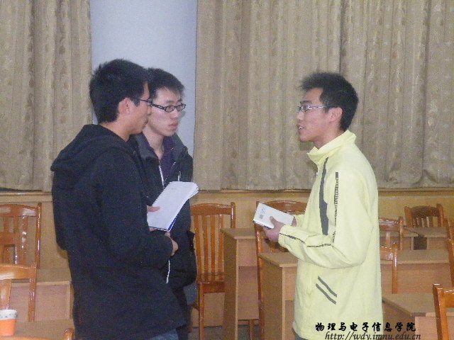 杨桂全同学(右一)正与王懋同学(左二)讨论作品