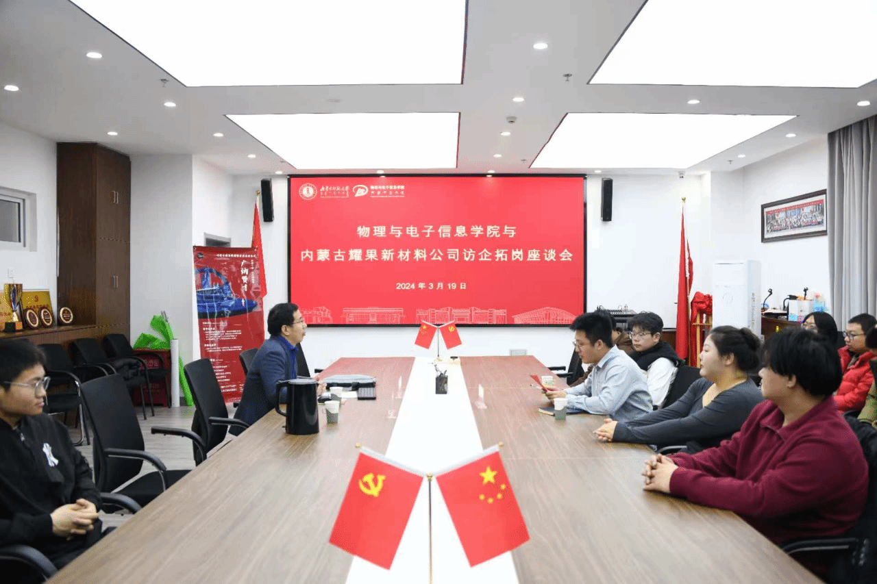 为深化校企协同育人机制,拓宽毕业生就业渠道,促进人才供需精准对接,3月19日上午,英国威廉希尔公司与内蒙古耀果新材料有限责任公司在理工楼A座举行访企拓岗座谈会暨专场招聘宣讲活动。公司党委副书记欧志强、辅导员冀锦涛与内蒙古耀果新材料科技有限责任公司高耀昌一行人进行洽谈交流,2025届材料物理专业毕业生参加活动。