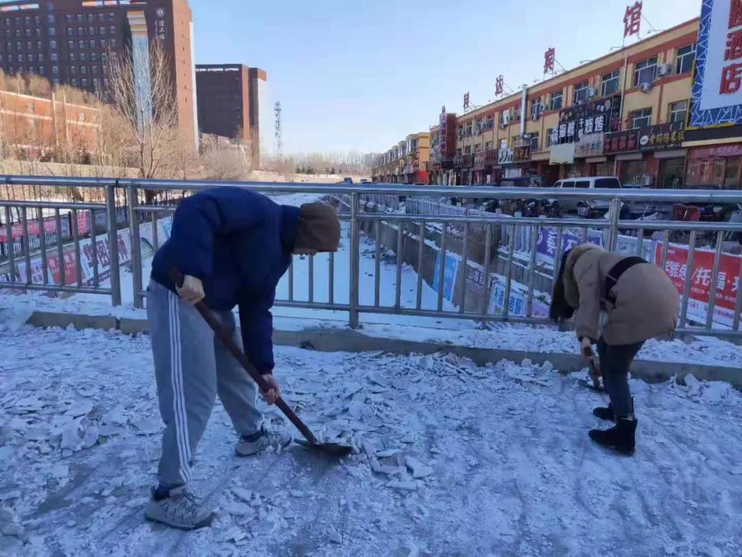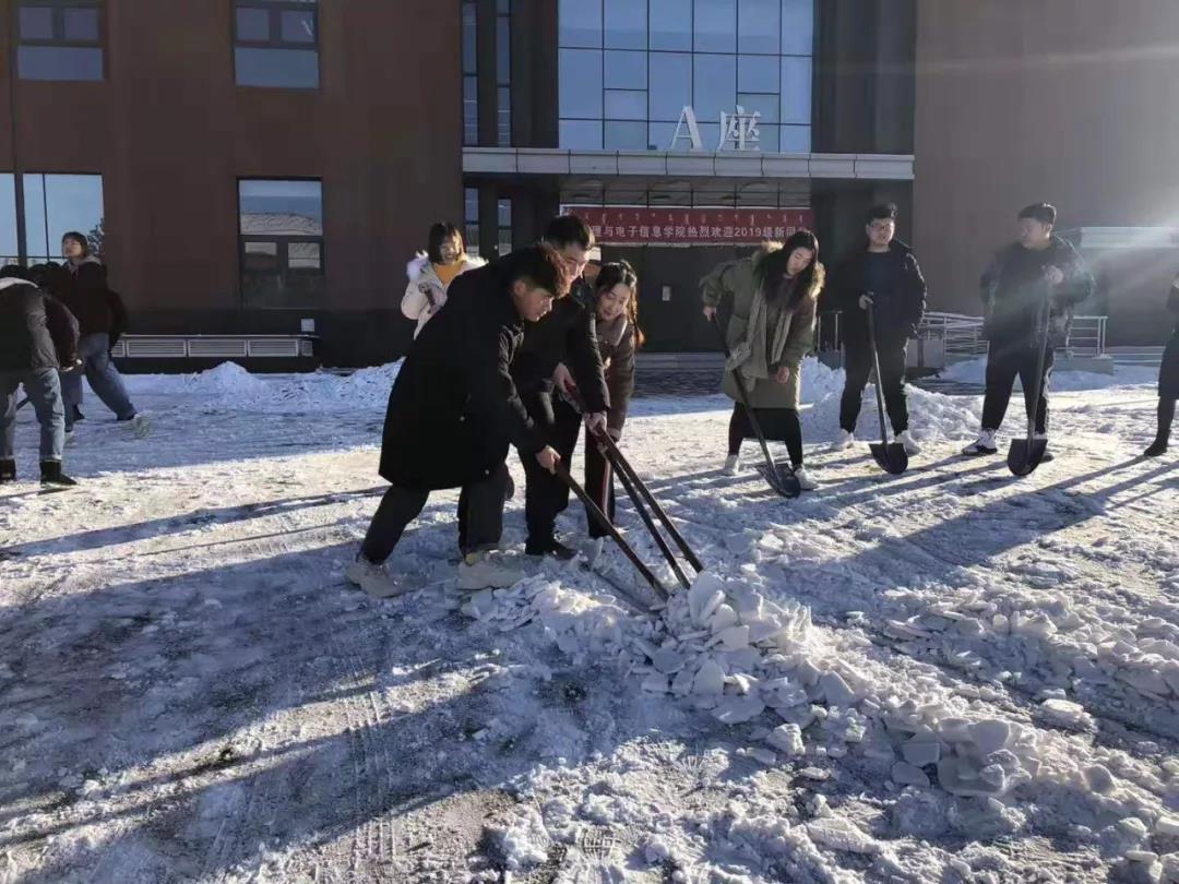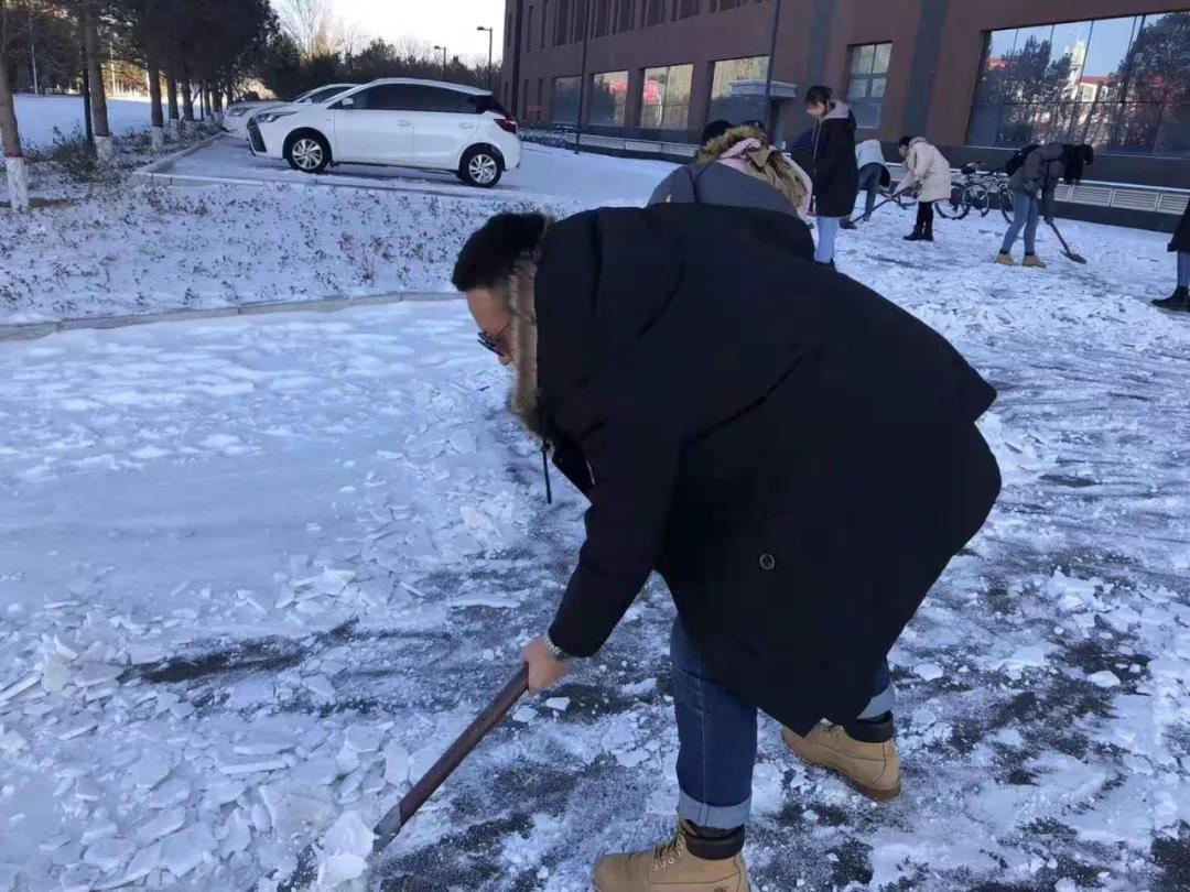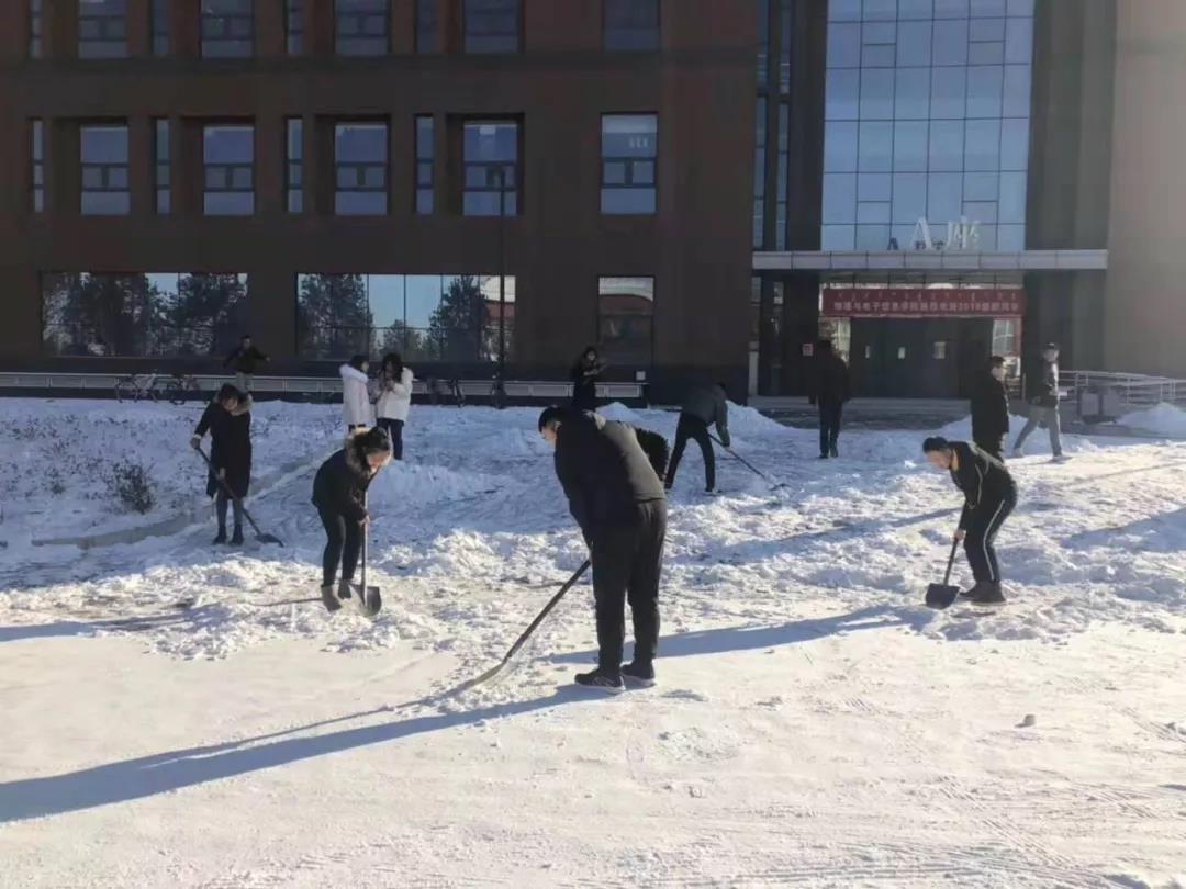 在负责人的带领下,参加活动的同学们携带劳动工具,来到理工楼及西门附近,积极投入扫雪任务,同学们分成几个小组,分工合作,经过一下午的努力,理工楼及西门主干道附近的雪基本被清理干净。