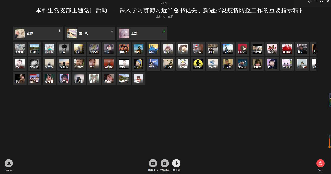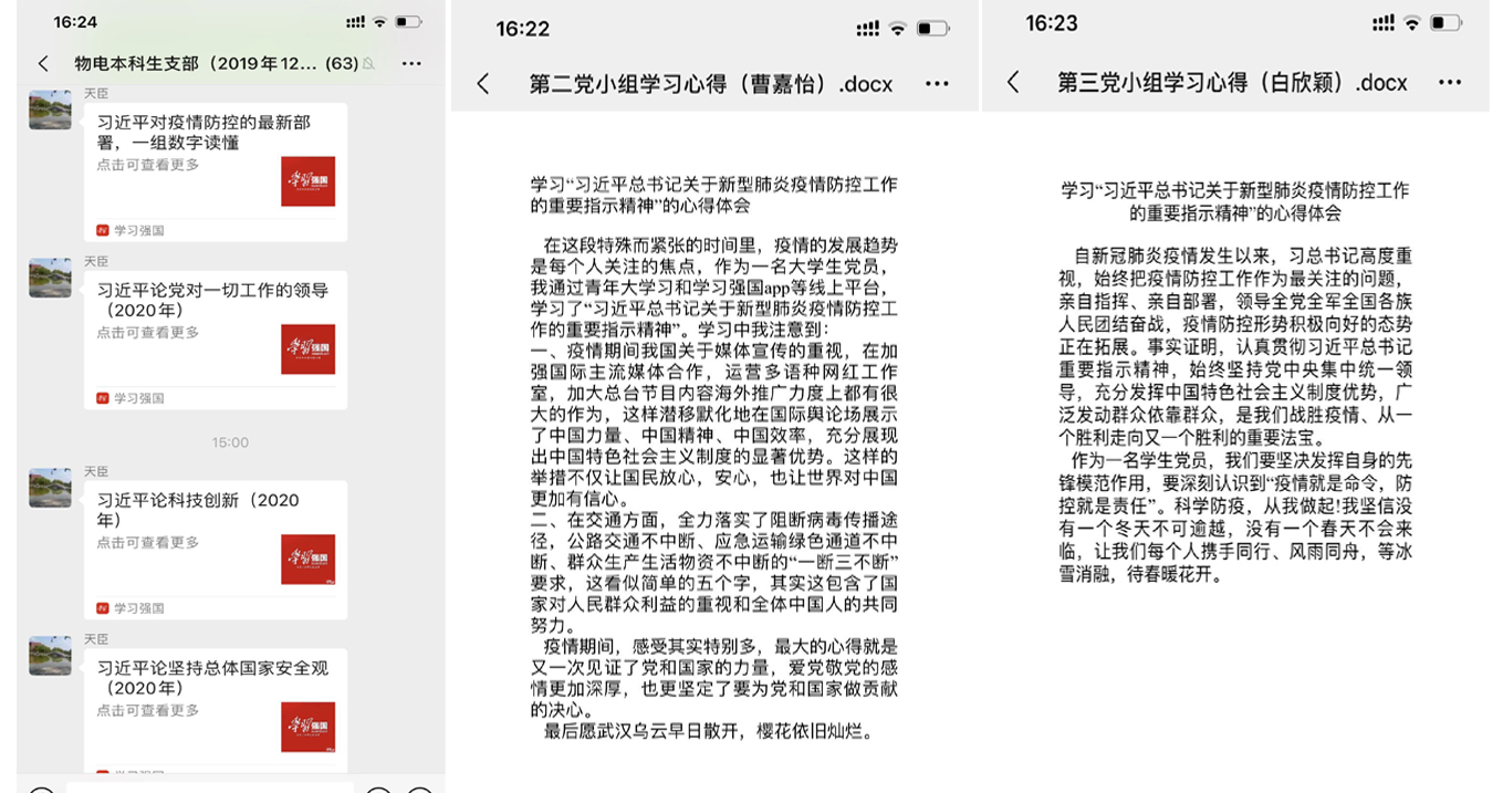本科生党支部于3月8日下午利用企业微信召开支部党员大会,深入学习讨论习近平总书记关于新冠肺炎疫情防控工作的重要指示精神,并对本科生支部严格落实“三会一课”制度、强化党员教育管理、预备党员培训等工作进行了部署。会议前后还分别召开了支部委员会议、党小组组长工作会议。