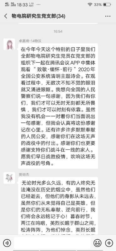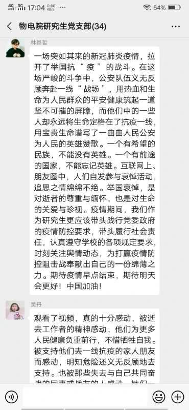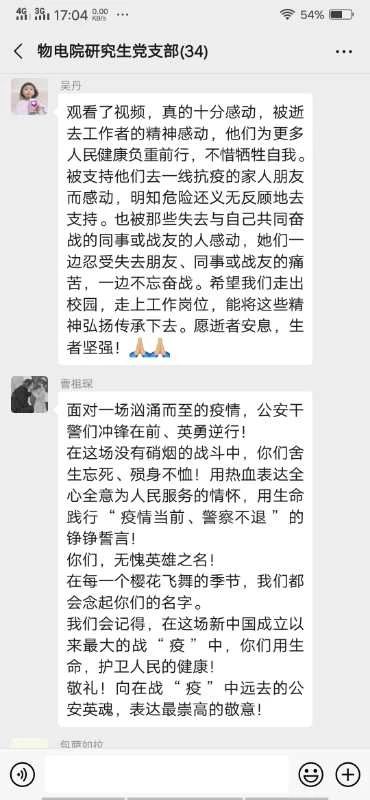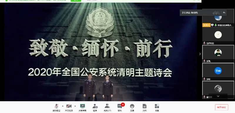 新冠肺炎疫情是新中国成立以来在我国发生的传播速度最快、感染范围最广、防控难度最大的一次重大突发公共卫生事件。在抗击疫情的严峻斗争中,一批医务人员、警务人员、社区工作者因公殉职,许多患者不幸罹难。为表达对抗击新冠肺炎疫情斗争牺牲烈士和逝世同胞的深切哀悼,公司研究生党支部于4月4日下午利用腾讯会议开展“缅怀英烈,致敬英雄”主题党日活动。本次党日活动主要由两部分组成:一、上午10点研究生党支部全体成员在家自行默哀3分钟,表达对抗击新冠肺炎疫情斗争牺牲烈士和逝世同胞的深切哀悼。二、下午3点通过腾讯会议方式集体观看“致敬·缅怀·前行”2020年全国公安系统清明主题诗会。本次活动由研究生党支部第四党小组组长林基哲主持。看完主题诗会后大家通过微信群里用文字形式谈观后感。