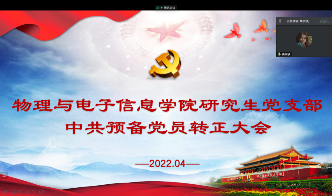 公司研究生党支部于4月19日在线上召开中共预备党员转正大会,大会由支部书记木其尔主持,讨论并表决了关于高宇欣,王华琛,王欣宁三名同志转为正式党员的相关事宜。