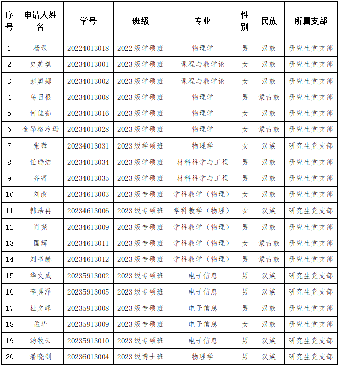 根据党章及中国共产党发展党员工作细则的有关规定,现予以公示,接受党员群众监督。凡对公示对象有意见及异议者,请在公示期内以口头或书面形式向研究生党支部或公司党委反映。