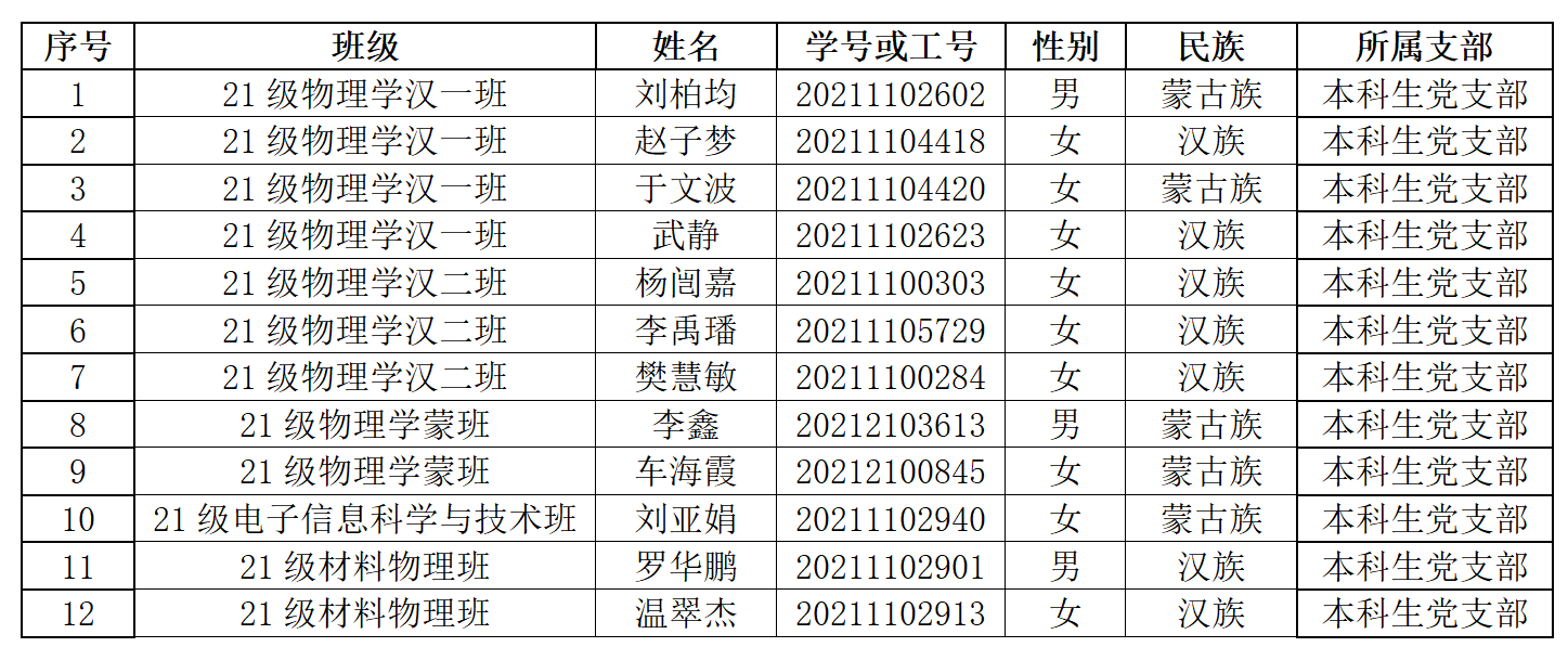 根据发展党员工作有关规定,经英国威廉希尔公司本科生支部召开支部委员会审查,刘柏均等12名同志预审合格,拟于近期召开支部大会讨论接收刘柏均等12名同志为中共预备党员。