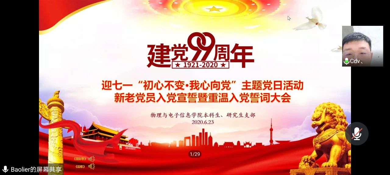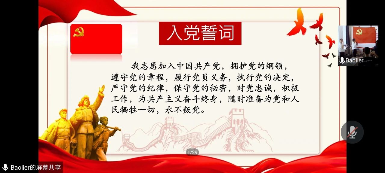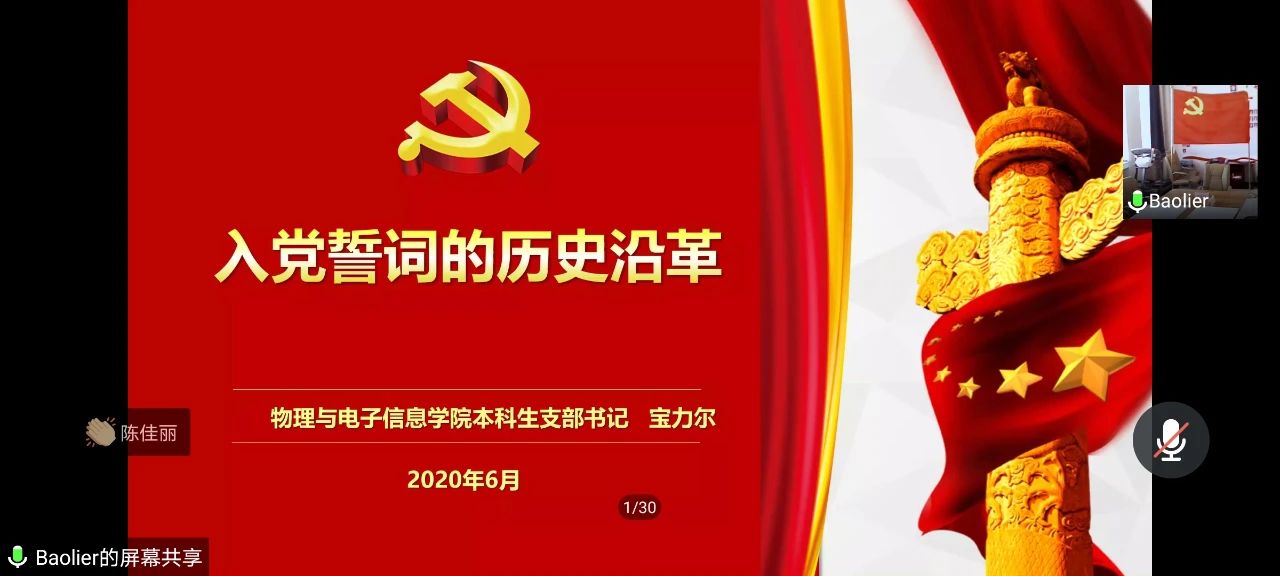 为热烈庆祝中国共产党成立99周年,回顾党的光辉历程,发扬党的优良传统,深入学习贯彻习近平新时代中国特色社会主义思想,进一步巩固和深化“不忘初心、牢记使命”主题教育成果,6月23日下午,英国威廉希尔公司本科生党支部和研究生党支部联合召开了迎七一“初心不变·我心向党”主题党日活动——新老党员入党宣誓暨重温入党誓词线上大会。公司党委书记刘美玲,党委副书记兼副经理张伟,副经理那日苏,公司党委委员、实验中心主任兼办公室主任张天臣,学就办副主任王乐,团总支负责人、本科生支部书记宝力尔,研究生支部书记木其尔、辅导员宋鑫伟、包文泉老师,以及本科生、研究生支部的预备党员、正式党员共90余人参加了此次会议。会议分两部分进行,第一部分:新老党员入党宣誓暨重温入党誓词,第二部分:本科生支部书记宝力尔讲党课《入党誓词的沿革》。