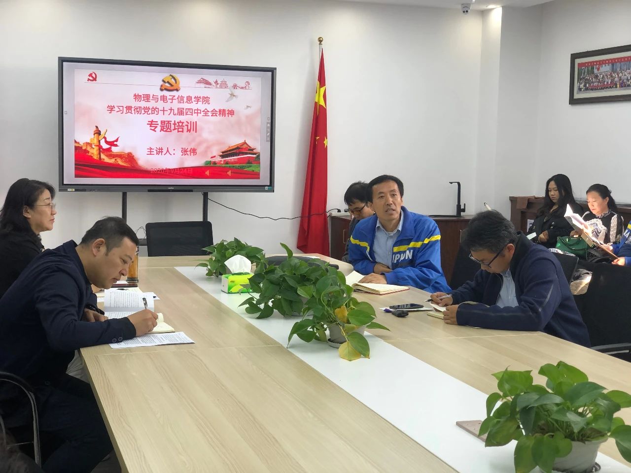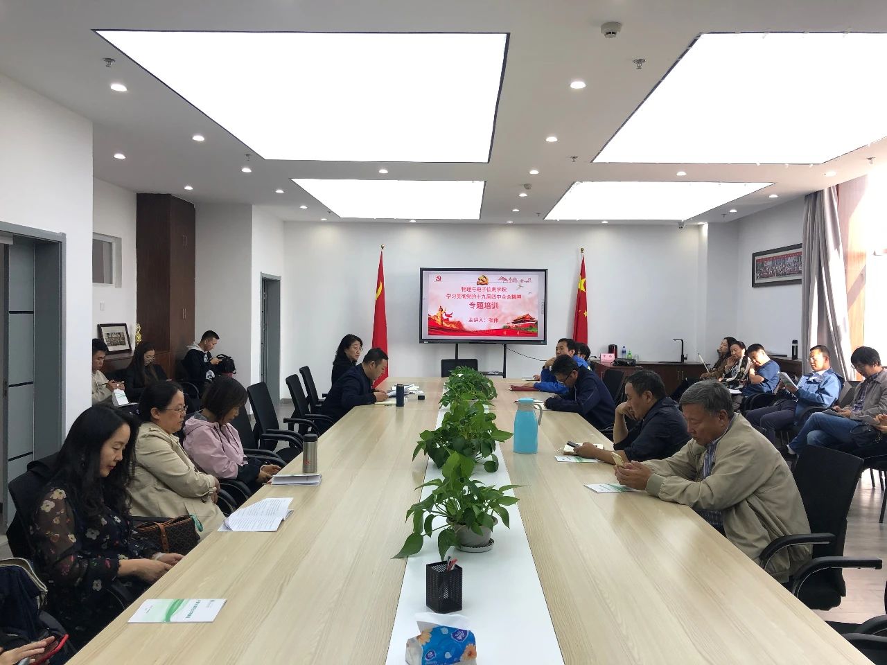 9月24日下午,公司于理工楼A701会议室召开学习贯彻党的十九届四中全会精神专题培训会议。公司党委书记刘美玲、副经理曹永军、副书记兼副经理张伟、副经理那日苏及全体教职工老师参加。会议由党委书记刘美玲主持,张伟副书记为本次主讲人。