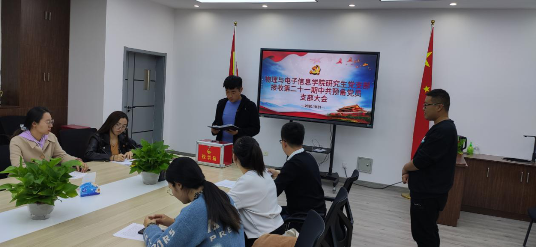 公司研究生党支部于10月31日在理工楼A0701会议室召开关于接收第二十一期中共预备党员支部大会。研究生党支部书记木其尔,全体研究生党员及4名被发展对象参加本次会议。木其尔老师主持会议。大会围绕接收丁研、郑树玉、陈智慧、王娜4名发展对象成为预备党员,并通过大会讨论决定发展对象的入党事宜。