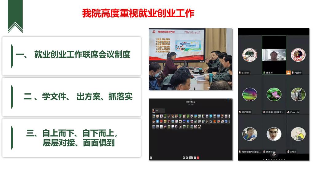 公司全体教师都积极参与到毕业生就业工作中,任课教师、毕业论文指导教师在员工毕业和就业工作中的指导作用进一步凸显。辅导员、班主任密切配合,细化工作安排,以年级、专业、班级为单位精心组织就业活动,开展全员、全方位、全过程就业指导。在每周的“就业汇报会”上,包联辅导员分别围绕“毕业生就业意向”“联系毕业生情况”“考研复试(调剂)情况”“发现的问题和难点”等内容进行工作汇报,分析存在问题,探讨解决办法。公司4位辅导员老师讲授《老员工职业生涯规划与就业指导》课,将就业理论和实践进一步结合。