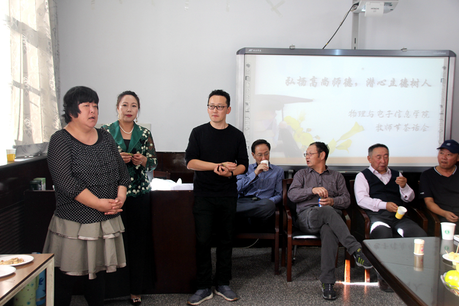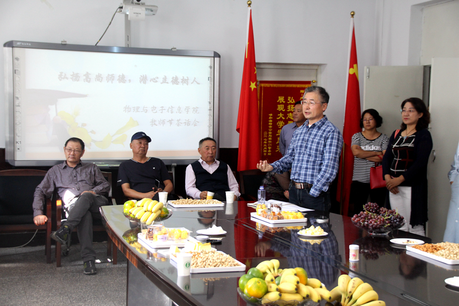 2018年9月7日,公司于物理楼会议室举办以“弘扬高尚师德,潜心立德树人”教师节主题茶话会。公司经理特古斯教授、副经理吉日嘎拉教授、副经理刘美玲老师、退休老教师及全体教师参加茶话会,会议由特古斯教授主持。
