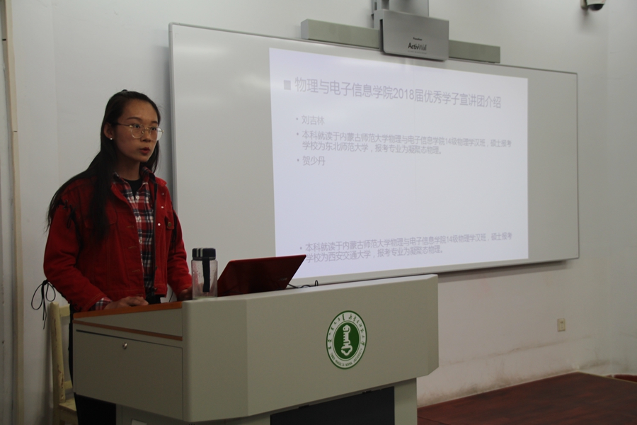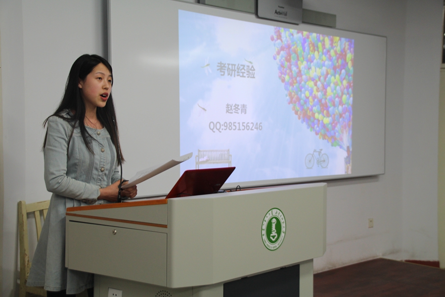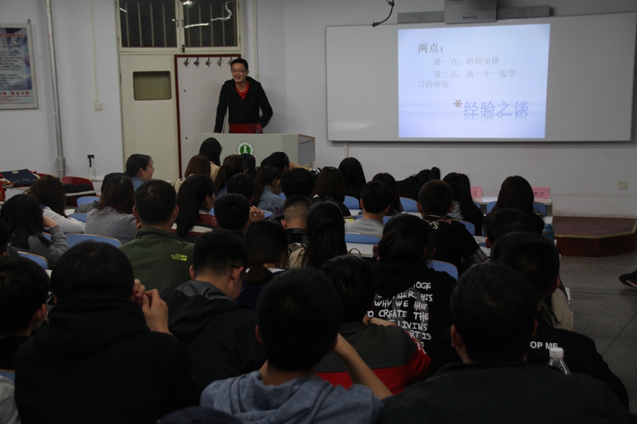 在主持人介绍完宣讲人后,宣讲交流会正式开始。首先由刘吉林同学开始演讲。宣讲中刘吉林同学谈了自己对于考研的理解与自己当时考研的心得体会。希望同学们首先问自己是否做到定好目标、调整心态、心无旁骛。最后送同学们几句话:有志者,事竟成;破釜成舟;百二秦关终属楚;苦心人,天不负;卧薪尝胆;三千越甲可吞吴。随后贺少丹、赵冬青、梁胜杰几位宣讲人一一上台,从学习方法、报考心态、复试技巧、个人经历等不同的角度为在座同学进行宣讲。赢得了在座同学的热烈掌声。