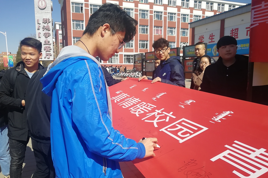 最后,各公司代表在标有“真情暖校园,青春见行动”的条幅上签字。