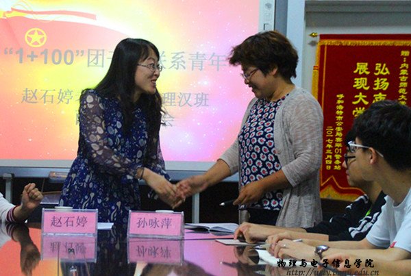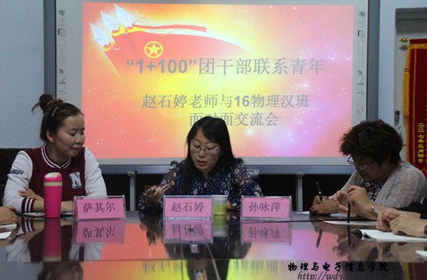 本网讯 2017年6月5日下午,公司于物电楼会议室开展了“1+100”团干部联系青年面对面交流大会。本次大会特邀校团委宣传部赵石婷老师作为主讲人,公司团总支书记萨其尔老师、16级物理汉班班主任孙永萍老师以及16级物理汉班全体同学参加,并由萨老师主持本次会议。