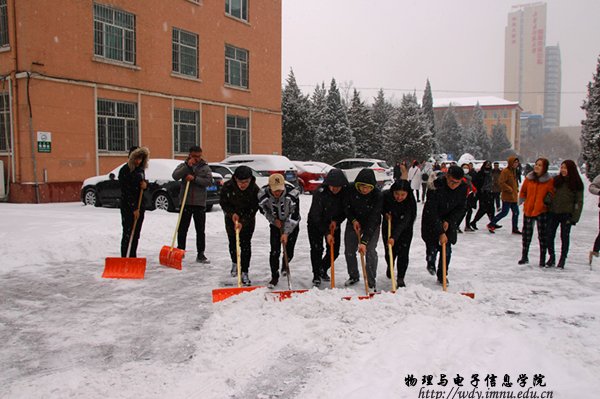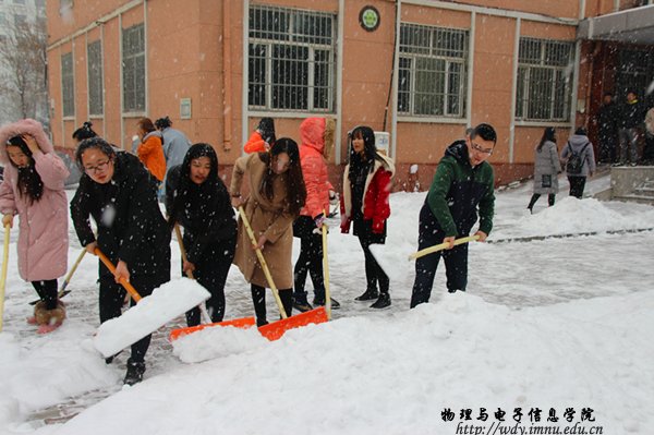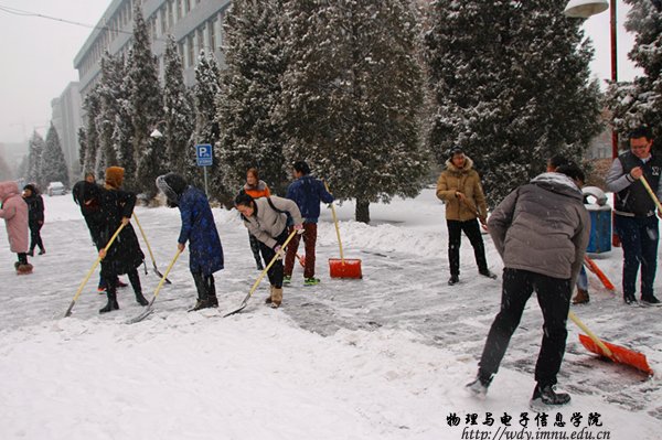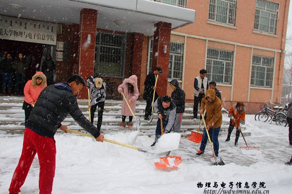 本网快讯 今日迎来开学以来的第一场大雪,为方便师老员工及老师们出行,2017年2月21日上午公司组织各年级员工利用课余时间对物理楼及附近主干道进行除雪活动。物电院员工清扫着路上的积雪,尽管条件恶劣,同学们依旧热情激昂,多劳动少抱怨,用自己的行动与热情温暖着雪后的师大,午饭过后,公司组织16级员工对物电楼前的主干道进行二次清扫。本次扫雪活动也展示出公司学子乐于奉献、利己及他的优良作风,在寒冷的天气中为师大送来一阵暖意。同时提醒大家,雪天路滑,请小心出行,注意安全。