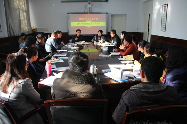 本网讯 2017年2月24日下午,公司在物理楼会议室召开2017年度班主任工作会议,公司党总支副书记何小龙老师、副经理刘美玲老师、团总支书记萨其尔老师和各班班主任参加了此次会议,并由何小龙老师主持此次会议。