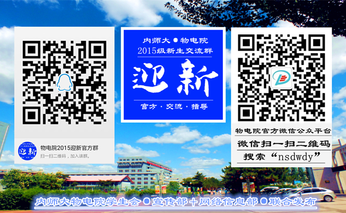 在此,衷心祝贺你们成为williamhill威廉希尔这个大家庭中的一员,现将“物电院2015级迎新官方群”和“物电院微信公众平台”二维码及账号公布如下,请扫描二维码进行关注以便交流答疑,衷心期待你的热情加入!