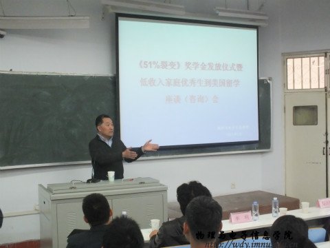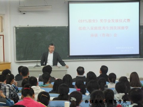 最后,同学们以热烈掌声欢迎《51%裂变》奖助学基金发起人单明先生讲话,并召开了低收入家庭优秀生美国留学座谈会。他指出,《51%裂变》低收入家庭优秀员工奖助学金基金会是他作为院员工于美国成立的公益基金会,其主要目的是通过“借一、还一、捐一”的滚动发展模式来帮助那些来自中国低收入家庭、有志向、有能力到美国、加拿大留学读研、工作、定居的优秀本科、研究生毕业生;基金会,不仅仅是要放大金钱,更重要的是要放大基金所宣扬的价值观念,放大人类社会中的正向成分,从而推动人类社会的正向发展。