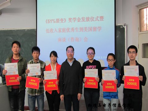 2014年5月8日下午,公司在田楼七共举行了《51%裂变》奖学金发放仪式暨低收入家庭优秀生美国留学座谈会。出席此次活动的有《51%裂变》奖助学基金发起人单明先生、公司员工会常务副秘书长陈佩文老师及公司党总支书记阿梅老师、特古斯经理;党总支副书记何小龙主持了座谈会,团总支萨其尔老师、学工办宋志强老师及各班班主任老师、同学近两百人参加了座谈会。