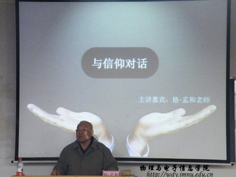 2012年11月23日上午10∶00点,由校团委主办,公司协办的一场“与信仰对话”专题讲座在田楼十四共进行,此次讲座主讲教师是法政公司的格·孟和老师。公司侯爱玲老师出席了此次讲座。