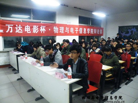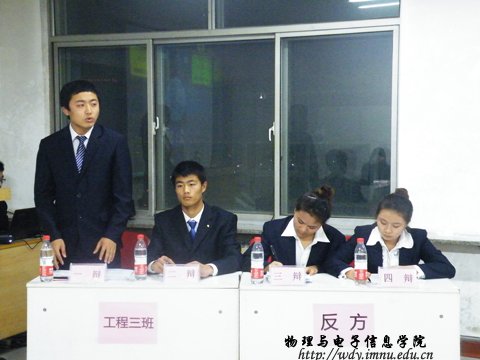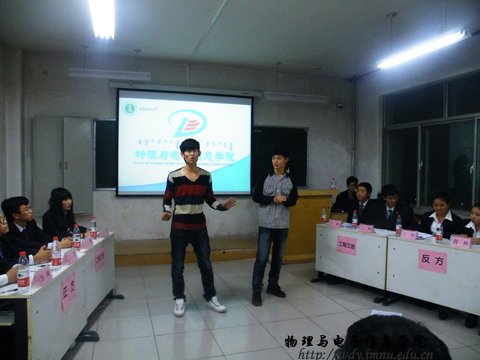 2012年11月17日晚7:30公司在田楼210教室举办了2012级新生“关爱生命,共建平安和谐校园”辩论赛初赛第二场比赛,参加此次比赛的正方班级是12级电子信息工程2班与反方电子信息工程3班,以“诚信主要靠自律还是他律”为辩题进行了一场唇枪舌战的辩论。担任此次辩论赛的评委有生活部部长马金辉,以及宣传部副部长郎晓良。