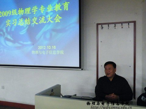 2012年10月16日晚上7点,公司在田楼十二共举行“09级物理学专业教育实习总结大会”,参加此次会议的有公司副经理吉日嘎拉老师、物理系主任张敏老师、实验中心副主任张天臣老师以及电子系副主任海鹰老师。此次会议由副经理吉日嘎拉主持。
