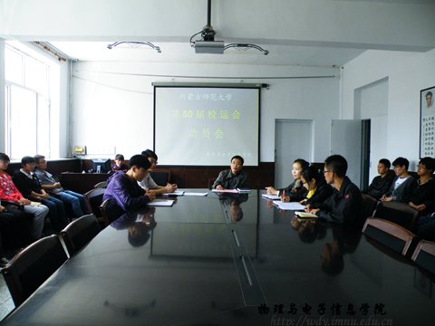2012年4月9日中午12:30,公司领导在物电院一楼会议室召开了第五十届公司运动会动员会,全院上下高度重视此次校运会,加大资金投入,由公司学工组全体老师负责开展训练参赛事宜。参加此次动员大会的领导有公司党总支副书记何小龙老师,学工办王伟老师、团总支萨其尔老师以及入选院队的所有运动员。