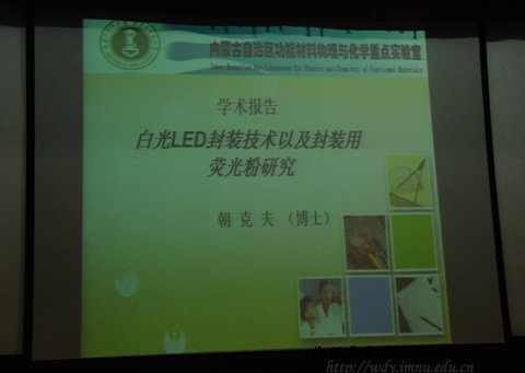 11月11日下午2:30,物理系青年教师朝克夫博士在物理楼会议室作了一场题为“白光LED封装及其封装用荧光粉的研究”的学术报告。报告会由副经理特古斯教授主持,公司相关系室教师和部分研究生参加了学术报告会。朝克夫博士从LED不同的封装类型及其发展背景出发,对LED的工作原理、半导体照明的优势逐一进行讲解,然后重点分析了白光LED封装及其封装用荧光粉的研究等问题。最后,针对现场提问,他对LED的构造和技术优势等问题为师生现场解说。在场师生表示,将积极参与朝克夫博士的研究项目,加强与其学术交流和合作。