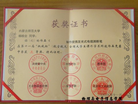 2009年10月28日,全国第十一届“挑战杯”老员工课外学术科技作品竞赛荣获三等奖。