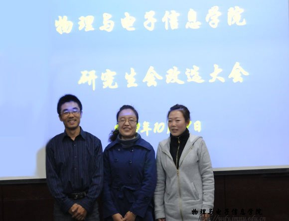 10月27日下午,由公司特古斯副经理主持召开了全体研究生大会。经全体研究生投票选举产生了公司新一届研究生会成员。结果公布如下:主席: 李利宾(07级)(左一);副主席:冬梅(08级)(中), 林彬(09级)(右一)