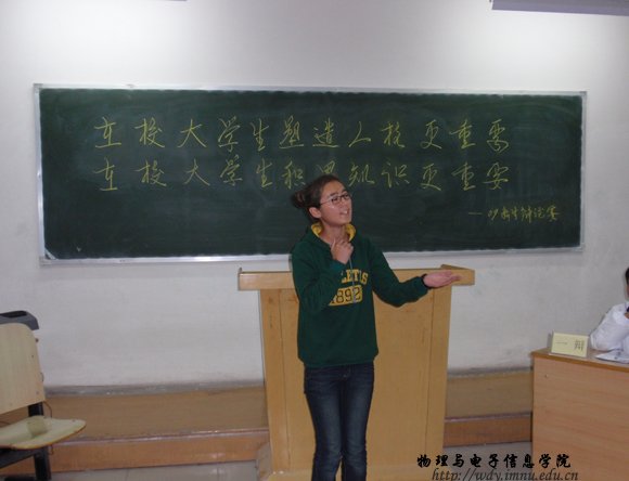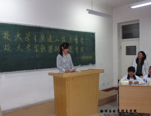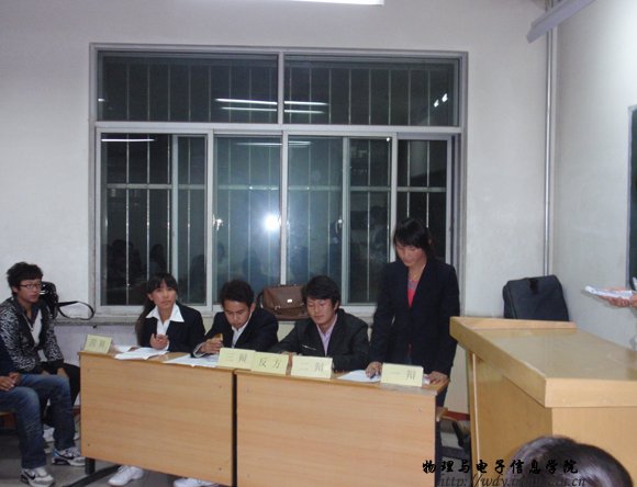 10月15日晚7:30,在田楼128进行了第一场比赛,正方为09工程1班,题目为在校老员工塑造人格更重要,反方为09物理蒙班,题目为在校老员工积累知识更重要。比赛当中各位辩手积极发言,气氛高涨。赛后,一些同学表演了优美的文艺节目,把辩论赛推向高潮。使辩论赛有了一个好的开头。最后,09工程1班获胜。明天将进行09工程2班和09物理汉班的比赛,敬请关注。