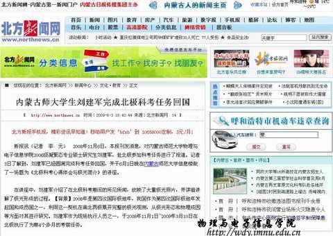 新报讯(记者 李 元) 2008年11月6日,本报刊发消息,对williamhill威廉希尔2006级凝聚态专业硕士研究生刘建军,赴北极参加科考任务进行了报道。记者3日了解到,刘建军已经圆满完成科考任务回国,并于6月2日晚在内蒙古师范大学信息楼做了一场题为《北极科考心得体会与极光简介》的讲座。