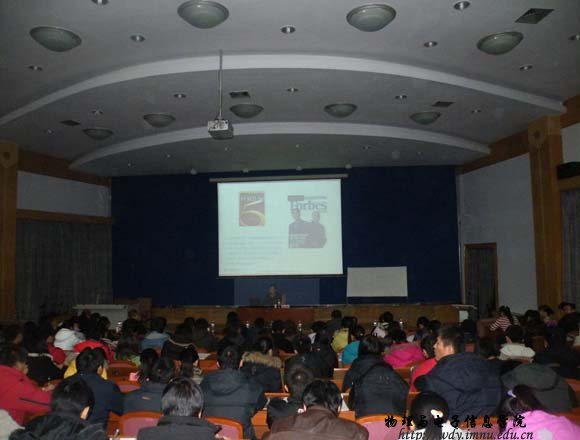 本次讲座主要讲述了作为国际奥委会全球合作伙伴的联想集团的创业史,发展史,以及一直支持着联想从一个名不见经传的小厂发展成为全球个人电脑市场的领导企业的“认真、严格、主动、高效”的企业亲情文化。吴敌先生还对老员工未来的就业方向作了指导。随后联想集团进行了有奖问答,并对同学们提出的问题进行了回答。