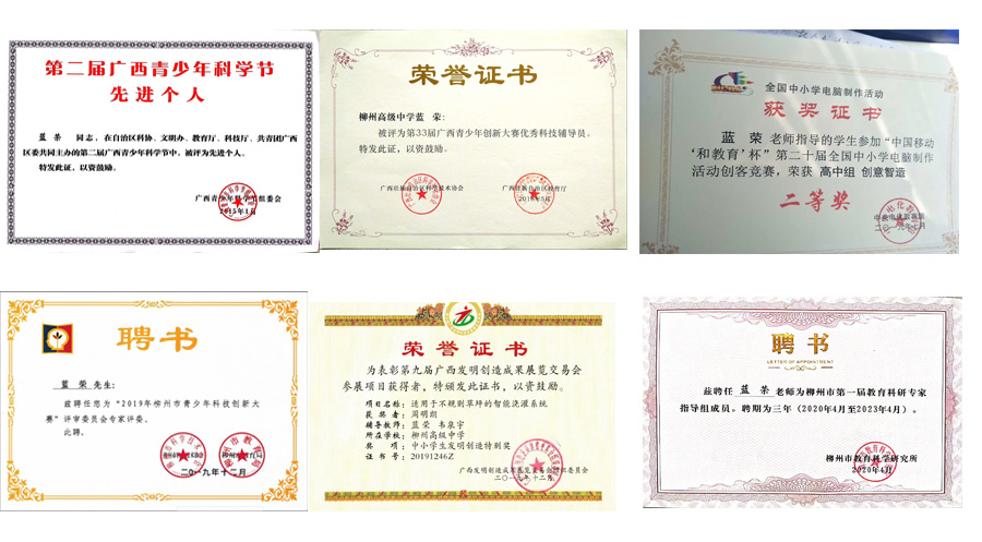 2013年9月,在柳州高级中学科技创新专业团队短缺的情况下,他又临危受命,担任公司通用技术教研组长,带领全组教师在全省突出重围,成为广西壮族自治区通用技术课程实施的一面旗帜。在一次省级通用技术课程改革研讨会上,蓝荣的教学设计得到了通用技术课程领域专家的一致好评,也引起柳州市教科所教研员的注意,这也让他有幸作为一线教师,进入市级通用技术课程专家组。在蓝荣心里,通用技术课程带动、深化了他的一些教学行为,为后期相关理论知识体系的构建提供了重要支撑。在几年时间里,他认真研究教材,刻苦锤炼教学基本功,先后参加柳州市通用技术教学设计比赛,获得一等奖2项。2018年代表广西参加全国通用技术教师技能大赛获得个人全国一等奖的好成绩! 在他的带领下,广西柳州高级中学通用技术教学团队先后两次获得全国通用技术教师技能大赛比赛一等奖的好成绩,这在广西壮族自治区属于首创。