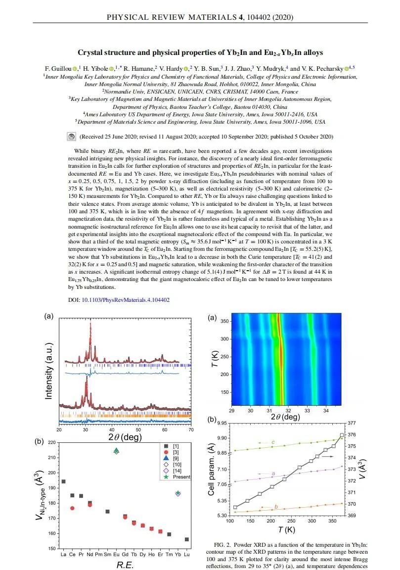 近日,公司英国威廉希尔公司Francois Guillou、伊博乐团队与法国卡昂大学、美国埃姆斯国家实验室和包头师范公司在新型磁相变材料方面取得重要研究进展,其研究成果以标题为“Crystal structure and physical properties of Yb2In and Eu2-xYbxIn alloys”在国际物理学术期刊Physical Review Materials上发表。公司Francois Guillou研究员为论文第一作者,伊博乐副研究员为论文通讯作者,williamhill官网功能材料物理与化学自治区重点实验室为第一完成单位和通讯单位。全文链接为:DOI:https://doi.org/10.1103/PhysRevMaterials.4.104402