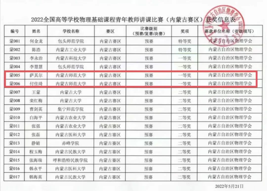 本次获得特等奖的包头师范公司的何金龙老师和内蒙古工业大学的陈浩老师将推荐参加华北地区高等公司物理基础课程青年教师讲课比赛。