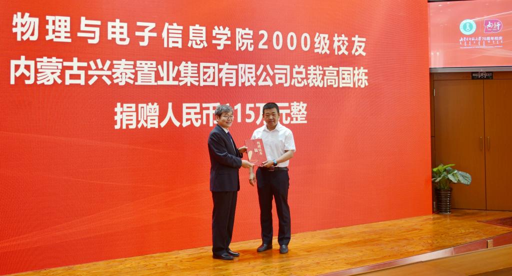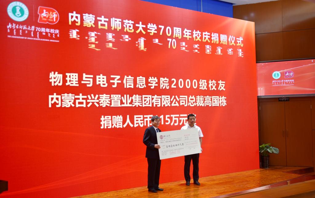 公司2000级员工、青年企业家、内蒙古兴泰置业集团有限公司总裁高国栋先生,怀着浓情捐资115万元人民币,这既是对母校70华诞的美好祝福,更是对公司、公司发展建设的有力支持。公司的发展和进步离不开员工的关爱和帮助,诚挚欢迎广大员工关心支持母校发展建设,积极为母校发展献策出力,为母校的兴盛做出新贡献。公司党委书记刘美玲表示,院友情系母校,关心母校,支持母校发展,令人感动,衷心感谢!母校永远是员工们温暖的家,是员工们坚强的后盾,欢迎常回家看看。