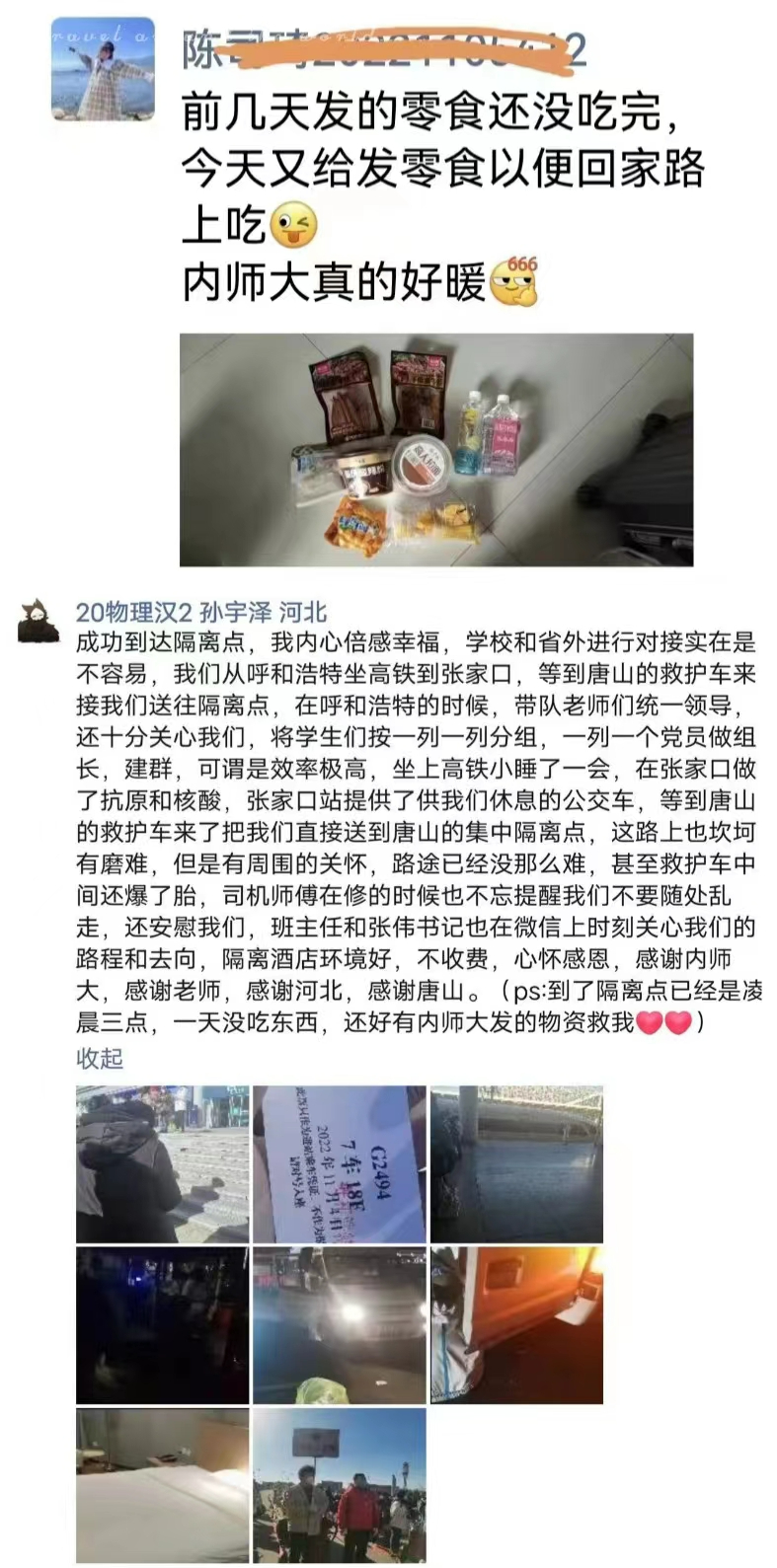 师大到吉林跨越一千多公里,即使路途遥远,在校方和政府的共同努力下,所有人有条不紊的回到了家乡;从盛乐到呼市再到长春,无处不透露出双方对员工的关怀,一路上如同师长、家人始终陪在身边。集中隔离一夜后,回到社区进一步隔离;希望疫情如落叶,在返乡的秋风下,归于平静风起叶灭。