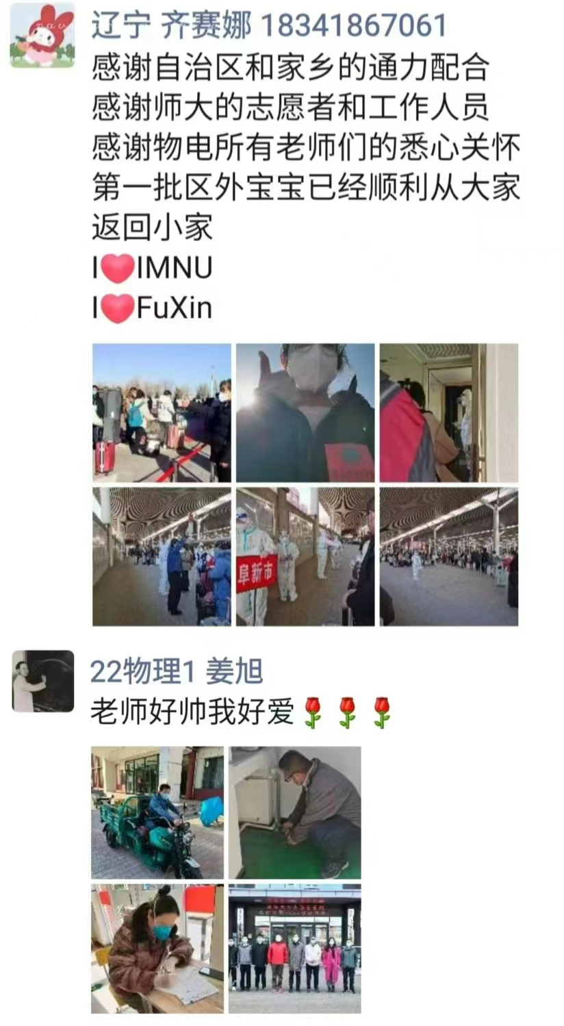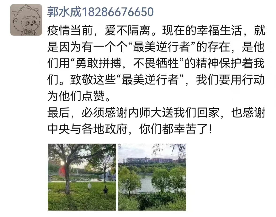 今天已经从酒店解除隔离,开始单人单户居家隔离,从疫情刚开始,我们师大的所有老师,就把员工安全放在第一位,在多方面协调下,把我们转运回家,作为首批返乡的学子,真是很感谢伟大的祖国,感谢政府,感谢我的老师,感谢所有为我们付出的工作人员,大难面前,快速反应,感谢疫情中所有逆行人,筑起防疫长城,拉起爱心防线,上下同心,共克难关!已经回到家乡的同学们遵照当地执行标准,配合防疫工作,没回家的同学们也相信公司,相信政府,好好学习,胜利就在眼前。没有一个寒冬不可逾越,没有一个春天不会来临!加油,同学们。 ——米宬泽
