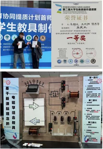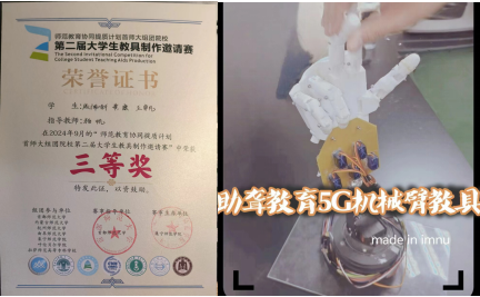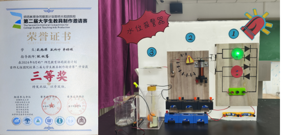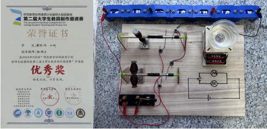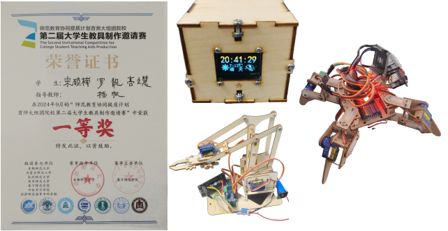本次比赛旨在加强师范教育协同提质计划首师大组团院校之间的深入交流,着力提升师范生的创新精神和实践能力,推动本科公司产品水平的不断提高。竞赛分为初赛和复赛两个阶段,通过线上提交和现场实物演示的方式进行评比。经过激烈角逐,公司共有5项作品成功晋级决赛,在参赛过程中同学们展现出优异的创新实力和竞赛实力,每一件作品都凝聚了参赛员工的智慧和汗水。最终,由张院生老师指导、乐舒文等制作的“基于新课标理念的自制电磁学组合教具”获得一等奖,由杨帆老师指导、宋硕楠等制作的“星火燎原系列教具”获得一等奖;由杨帆老师指导、成佩轩等制作的“助聋5G机械臂教具”获得三等奖,由张林睿老师指导、朱越辉等制作的“水位报警器”获得三等奖;由张院生老师指导、唐铭浩等制作的“自制电动机—涡旋”获得优秀奖。