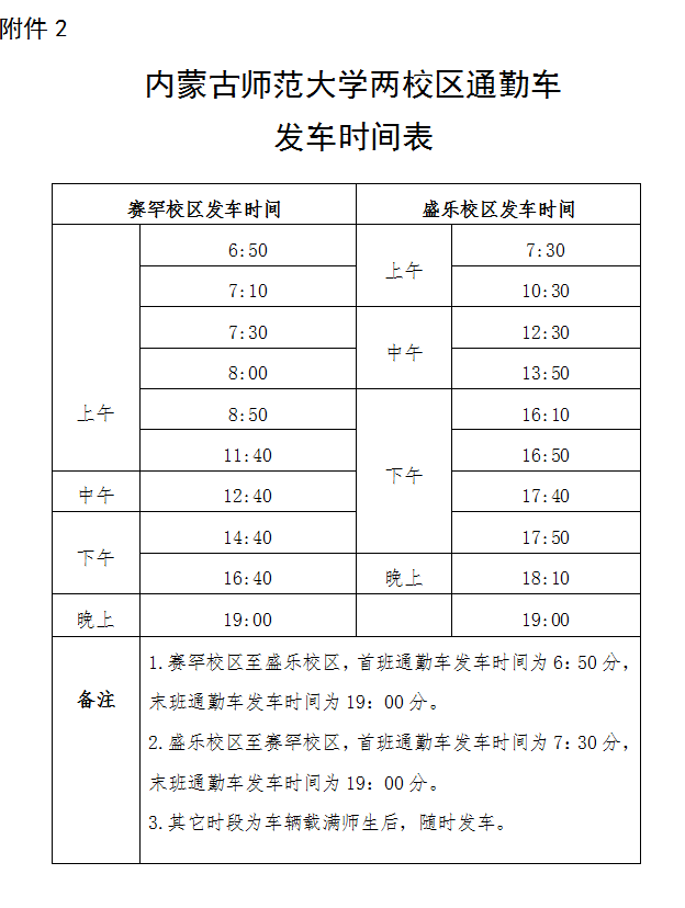2.两校区发车时间: 赛罕校区早始发车时间为6:50;末班车发车时间为19:00。 盛乐校区早始发车时间为7:30;末班车发车时间为19:00。其他通勤车发车时间安排详见附件2:williamhill官网两校区通勤车发车时间表。