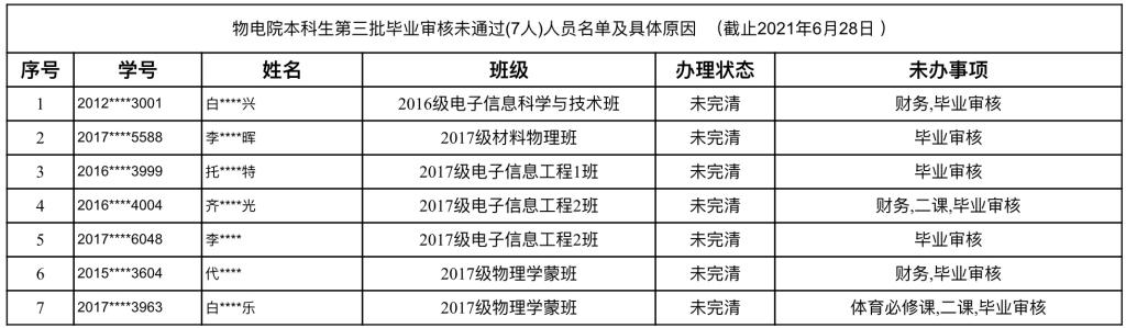 物电院本科生第三批毕业审核未通过(7人)人员名单及具体原因