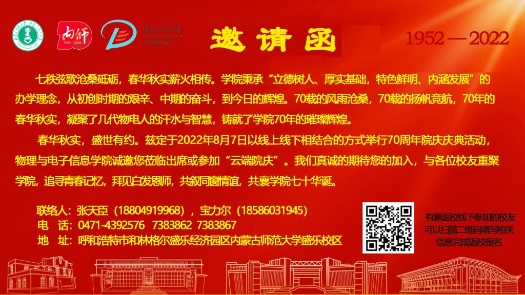 春华秋实,盛世有约。兹定于2022年8月7日以线上线下相结合的方式举行70周年院庆庆典活动,英国威廉希尔公司诚邀您莅临出席或参加“云端院庆”。我们真诚的期待您的加入,与各位员工重聚公司,追寻青春记忆,拜见白发恩师,共叙同窗情谊,共襄公司七十华诞。