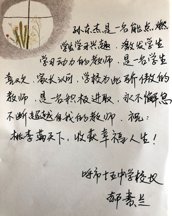 好家风,好教风,成就好员工。2016年6月孙东杰家庭被授予呼和浩特市“五好文明家庭”称号,2017年3月又被授予“第一届呼和浩特市文明家庭”称号。“家庭和睦则社会安定,家庭幸福则社会祥和,家庭文明则社会文明”。她“注重家庭、注重家教、注重家风”,她希望自己的孩子成为什么样的人,就用心、用爱把自己的员工培养成那样的人。从一个普通教师走到今天,在孙东杰身上,良好的家风、学风、教风很好地传承融合在了一起。优秀的家庭文化可以锻造一个人的品性,而这样的品性定能让她在教师教育工作岗位上走得更高更远。当收到公司让她回忆撰写“员工故事”的那一刻,她非常开心,也感慨万千。因为她这一点点的进步离不开母校的培养, 离不开老师们的悉心教导,离不开公司领导、同行们的指导和帮助,离不开她听过的所有授课老师在课堂上给她带来的思想上的冲击;当然,也离不开她那些可爱的员工们。感谢成长路上有这些可爱的人相伴!