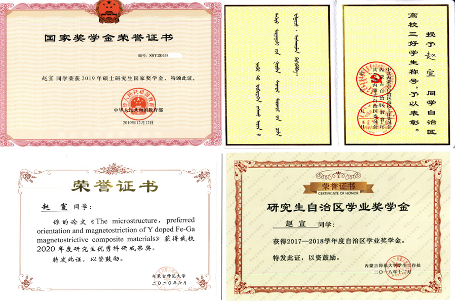 读研期间,赵宣参与了有关磁致伸缩材料领域的国家自然科学基金和内蒙古自治区自然科学基金项目各1项。他不仅仅关注自己研究的磁致伸缩材料,同时也对课题组的新能源材料感兴趣,他还参加了内蒙古自治区2017年老员工创新创业训练计划——《Mg2Ni储氢合金的固相烧结及其球磨改性研究》项目,项目小组的五位成员对Mg2Ni储氢合金的固相烧结及其球磨改性进行了详细的研究。“合理的人员搭配,也让我们能通过讨论解决所遇到的难题。以这些前提为基础,小组成员严谨的治学态度,细致的实验分析,以及极大的热情和精力的投入,使得这个项目得以顺利进行,并最终取得了不错的成果。”他说,项目的最终成功离不开项目组的通力合作。在良好的团队合作氛围的感染下,赵宣也收获了2019年度研究生国家奖学金,这更加激励自己不断学习,积极进取,为实现人生目标而不懈奋斗。