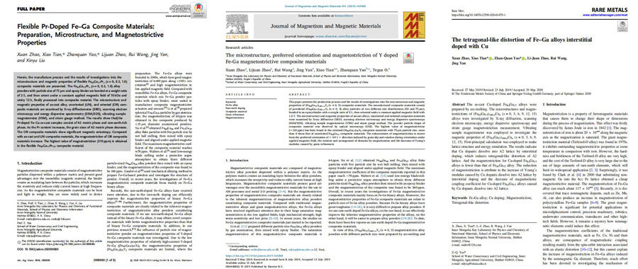 [1] Rui Wang, Xiao Tian*, Zhanquan Yao, Xuan Zhao, Hongbo Hao, Influence of rare earth element terbium doping on microstructure and magnetostrictive properties of Fe81Al19 alloy, Journal of Rare Earths, 2020, https://doi.org/10.1016/j.jre.2020.12.009. (SCI收录,中科院2区)