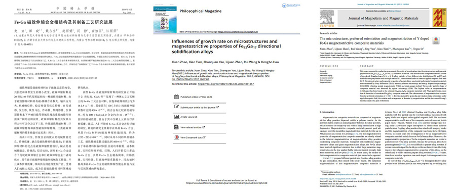 [6] Xuan Zhao , Xiao Tian*, Zhanquan Yao , Lijuan Zhao , Rui Wang & Hongbo Hao, Influences of growth rate on microstructures and magnetostrictive properties of Fe83Ga17 directional solidification alloys, Philosophical Magazine, 2020, https://doi.org/10.1080/14786435.2020. 1861357.(SCI收录,中科院4区)