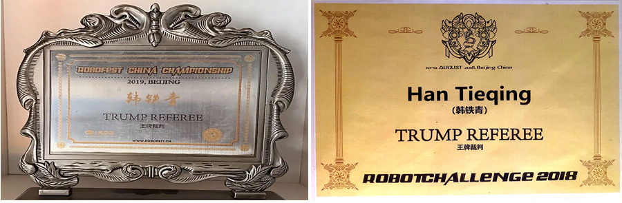 韩铁青还有一个身份就是机器人大赛裁判。2017年他带领的员工在Robofest世界机器人锦标赛(中国赛)获得全国亚军,同时在2017年Roborave国际机器人大赛(亚洲赛)获得亚洲赛亚军的优异成绩,这样他也成为了全国机器人比赛的焦点人物之一。在比赛官方的重重选拔下,韩老师在2018年2月份成功的当选全国机器人比赛裁判员,他秉承公正、公开、公平的原则对每一组比赛选手进行裁判,在2018年7月份在中国—北京举办的Robotchallenge国际机器人挑战赛(世界赛)被任命为王牌裁判。值得一提的是,2017年5月他带着6名选手代表中国队参加了在美国佛罗里达州奥兰多举办的Robofest世界机器人锦标赛(世界赛),经过13小时漫长的飞行他们来到了美国,经过15天的艰苦奋战比拼,他指导的孩子们在26个国家中脱颖而出获得了一等奖。