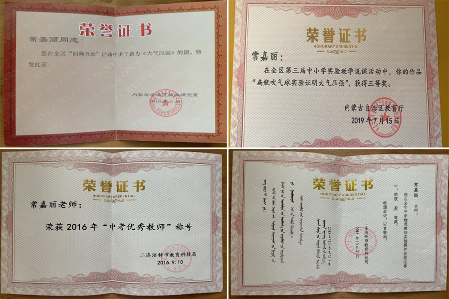 “作为90后教师,我是终身学习践行者,每年至少阅读100本书,积极参加校内外各类培训,只有不断反思和学习,才能不断地提升自我,成就自我”,她说。工作期间,她发表的论文《投入型学习框架下的边远地区初中物理教学实践》,针对边远地区公司初中物理课堂教学改革中遇到的实际教学问题,采用和借鉴新加坡提出的"投入型学习"框架这一课堂教学指导原则,对内蒙古二连浩特市第一中学两个平行班级的初中物理课堂教学,对"投入型学习"框架下的初中物理教学的可行性和有效性,进行了实践教学研究。2020年1月参加北京大学教育公司生涯导师(中级)培训班,完成54学时课程学习,获结业证书。
