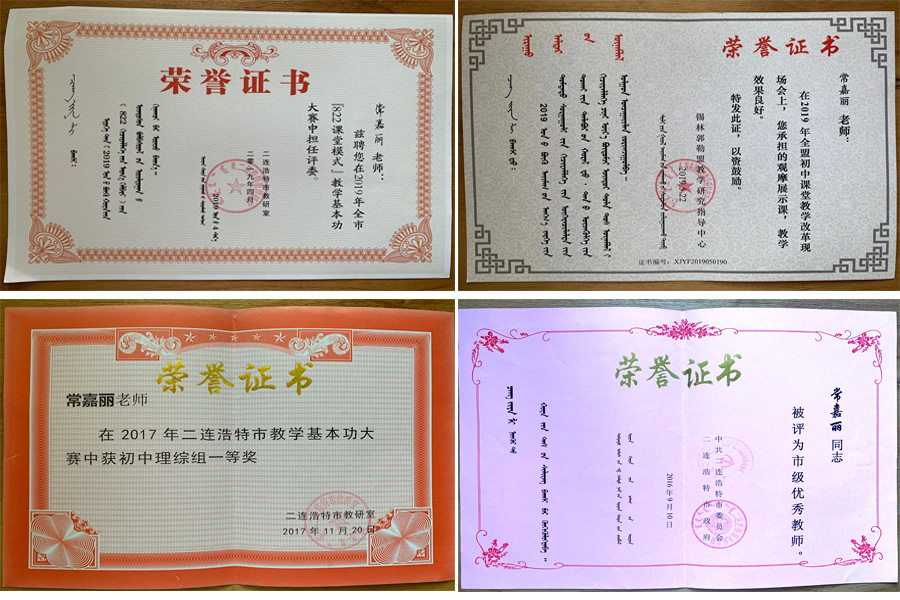 2014年至今,参加工作7年,她先后担任物理教师、班主任、初中部教务处主任、校课程研究中心副主任等职。在二连浩特市领导和第一中公司领导的培养下成长得很快,得到员工和家长的广泛认可。先后被二连浩特市委市政府评为“市级优秀教师”,被二连浩特市教科局评为“中考优秀教师”,获二连浩特市教学基本功大赛一等奖,在锡林郭勒盟初中课堂教学改革现场会承担物理学科观摩展示课……